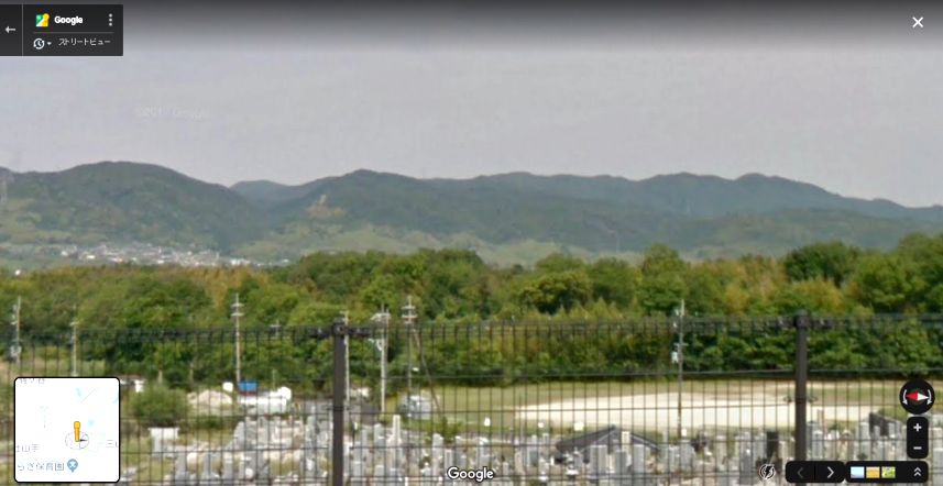 グーグルのストリートビューの画像。山並みが一致。もう少し北の方がしっくりする。