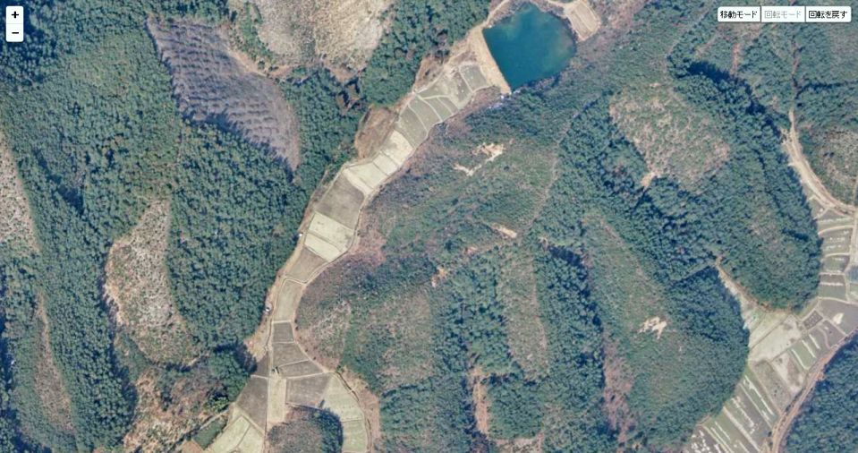 | 国土地理院の「国土変遷アーカイブ」による1975年撮影の航空写真。本編は池の左下あたりから南西を撮ったと思われる。中央やや左に小さく見える小屋が画像Aに映っている。 ↓ |
