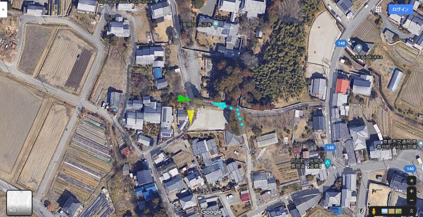 | グーグルマップによる現地画像。同作の納屋のすぐ東である。画像Aは黄色い矢印方向、画像Bは黄緑の矢印方向で取得した。本編の八兵衛とお女中は、水色の矢印に移動していると思われる。 ↓ |