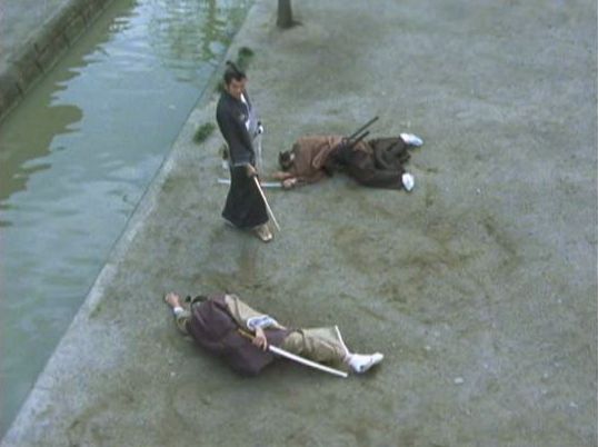 長七郎が門から出てきてカメラがパンすると、門前に水路がある。