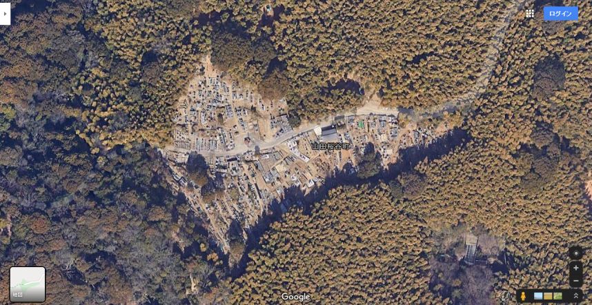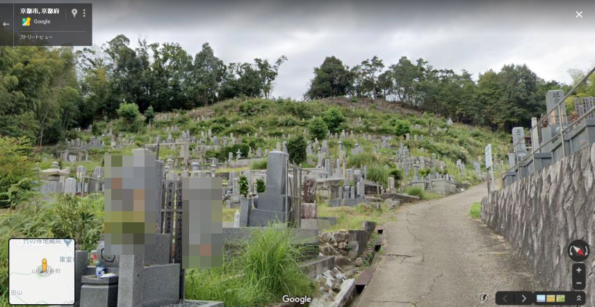 | グーグルのストリートビューの画像。奥に高所があり、墓地を見下ろした絵が撮れる。 ↓ |