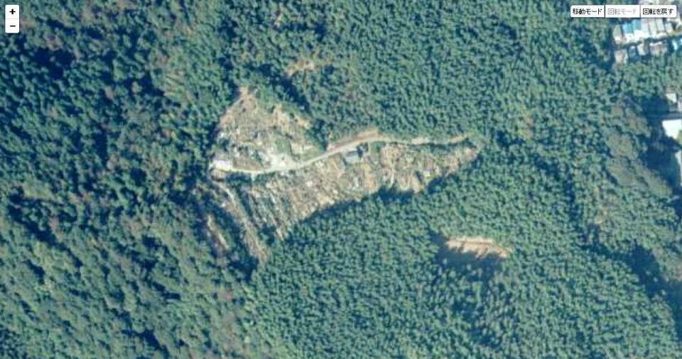 | グーグルマップによる現地画像。本編画像は、西の高所から東の小屋を見下ろして撮っていると思われる。 ↓ |