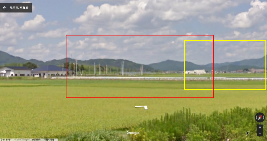 現地のやや東から取得したグーグル・ストリートビューの画像。赤い枠内が画像Aと、黄色い枠内が画像Bと一致。