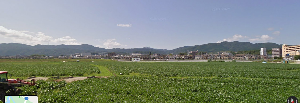 | 保津町下中島から取得したグーグルのストリートビューの画像。山並みが一致していると思う。 ↓ |
