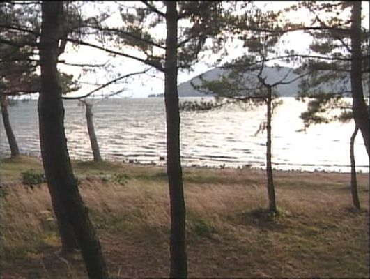 浜辺から南方向を見る。奥に見えるのは沖島。