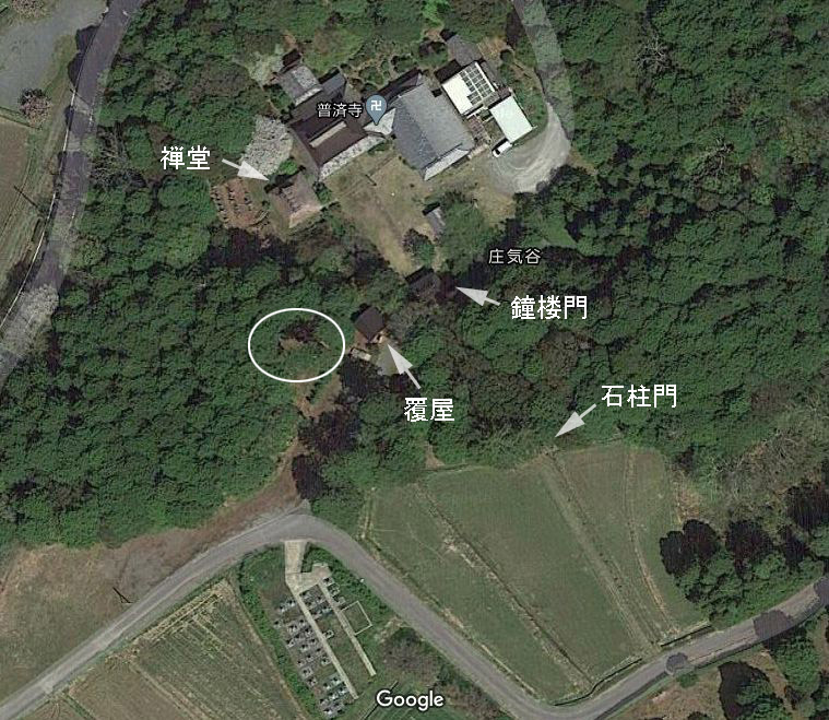 上の空中写真の白い円のあたり。塀と門は大道具。本堂の屋根の上端(右)と禅堂(左)が見える。