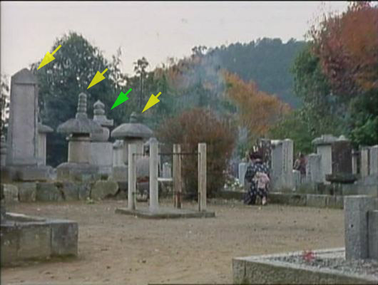 「鬼と呼ばれた父の真実」のシーン。矢印の墓石が一致。黄色い矢印の墓石は手前に、緑の矢印の墓石は奥にある。「真実探す娘の狂言」のカメラ位置は墓石の向こう側。