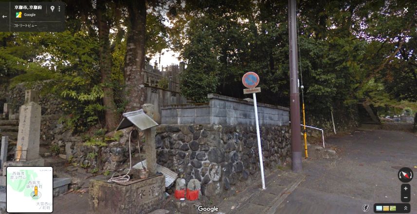 池の南端あたりのストリートビューの画像。奥の左へ上がる石段がロケ地かと思われる。