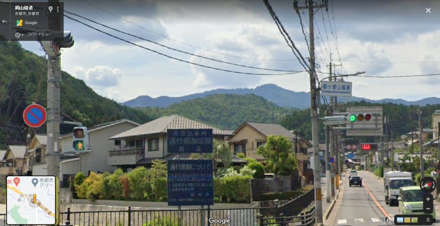 麓の周山街道から取得したグーグルのストリートビューの画像。高所にある三宝寺の霊園からは、本編のような絵が撮れるのではなかろうか。