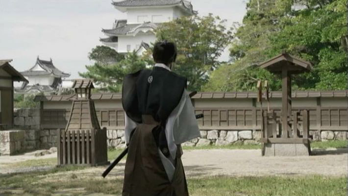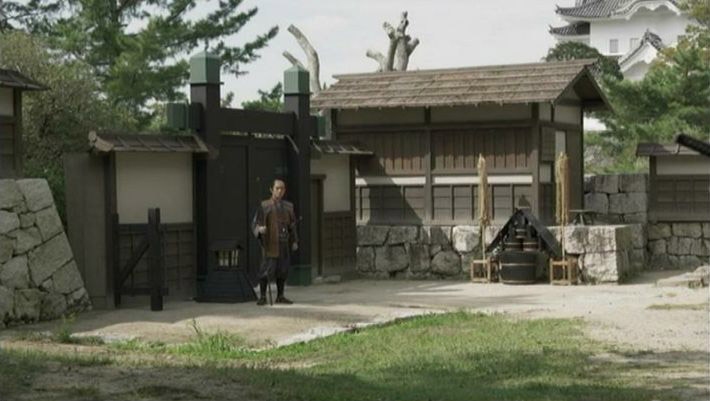 このシーン。城代屋敷跡の北西の石段周辺に、門や小屋や塀をしつらえてある。