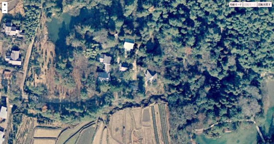 | 国土地理院の「国土変遷アーカイブ」による1974年撮影の航空写真。当時は雲母不動堂(きららふどうどう)の西に隣接するお堂が無かったことに注意。 ↓ |