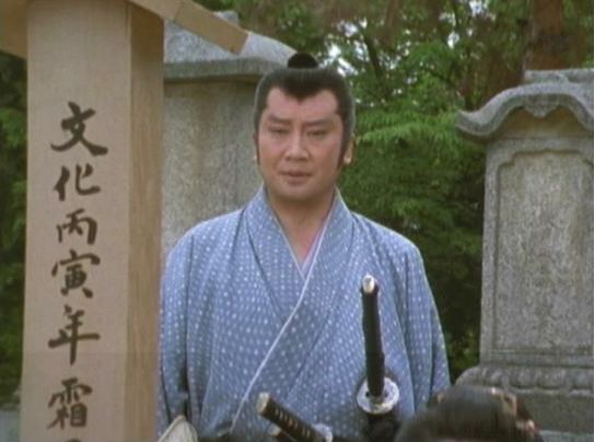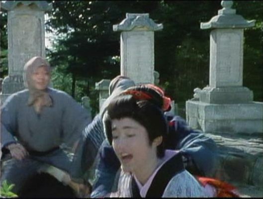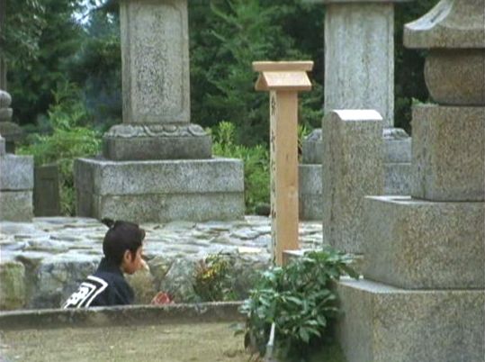 | 「水戸黄門」の「真実探す娘の狂言」のシーン。これも土台が石造り。左端の墓石が「闇に咲く花」の右端の物と同じだと思う。 ↓ |