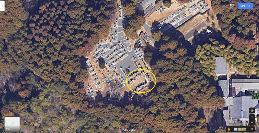 グーグルの空中写真で見る三宝寺北西の霊園。黄色い円内を南から撮っていると思う。