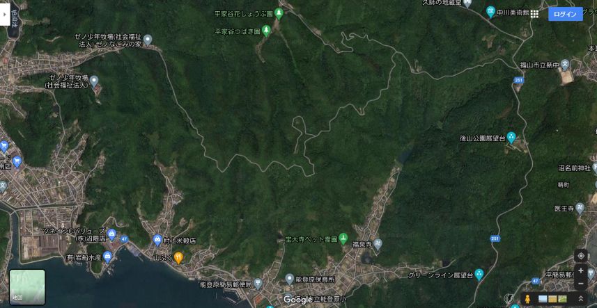 | グーグルの空中写真。中央あたりの林道がロケ推定地。この一帯は「臼木山森林公園」というらしい。(現地の看板では「臼木山憩いの森公園」) ↓ |