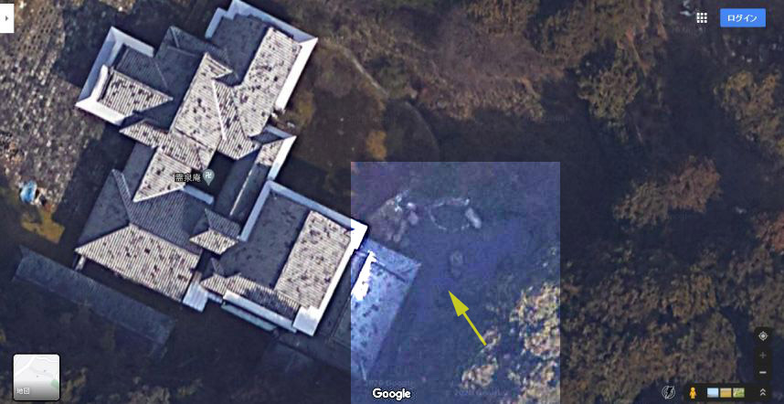 | グーグルの空中写真。明度を上げた部分は池。母屋の一部は池にせり出している。池の岩の配置にも注目。黄色い矢印方向に撮っている。 ↓ |