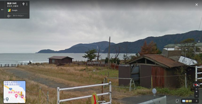 | 宮津市由良から取得したグーグルのストリートビューの画像。由良川を越えた舞鶴市西神崎(画像の右奥方向)から見た方がしっくりした絵になるが、そちらは見通しが悪かった。 ↓ |