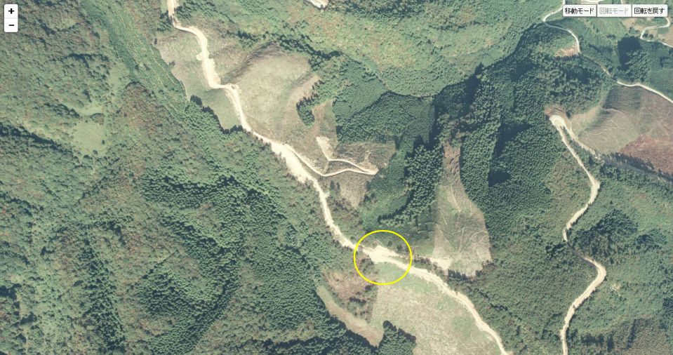 | 国土地理院の「国土変遷アーカイブ」による現地周辺の1982年撮影の航空写真。黄色い円内がロケ推定地。 ↓ |