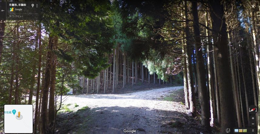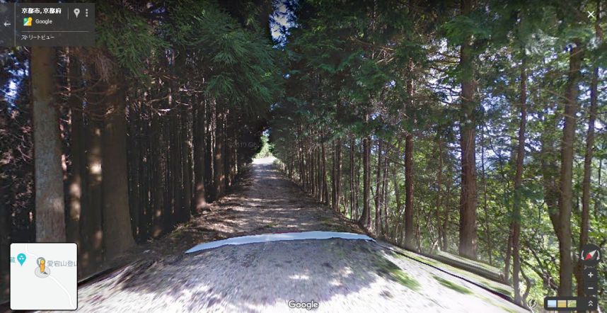 | グーグル・ストリートビューの画像。林道脇はすっかり木立ちに覆われてしまった。 ↓ |