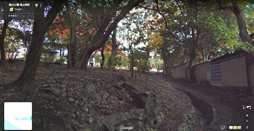 グーグルのストリートビューの画像。「嵐山 祐斎亭」の北沿いの壁。大幅に改修されている。