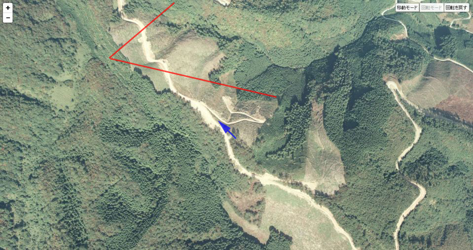 | 国土地理院の「国土変遷アーカイブ」による現地周辺の1982年撮影の航空写真。画像Aは東へ下る枝道を青い矢印方向に撮り、画像Bは赤い画角で東方向に撮っていると思う。 ↓ |