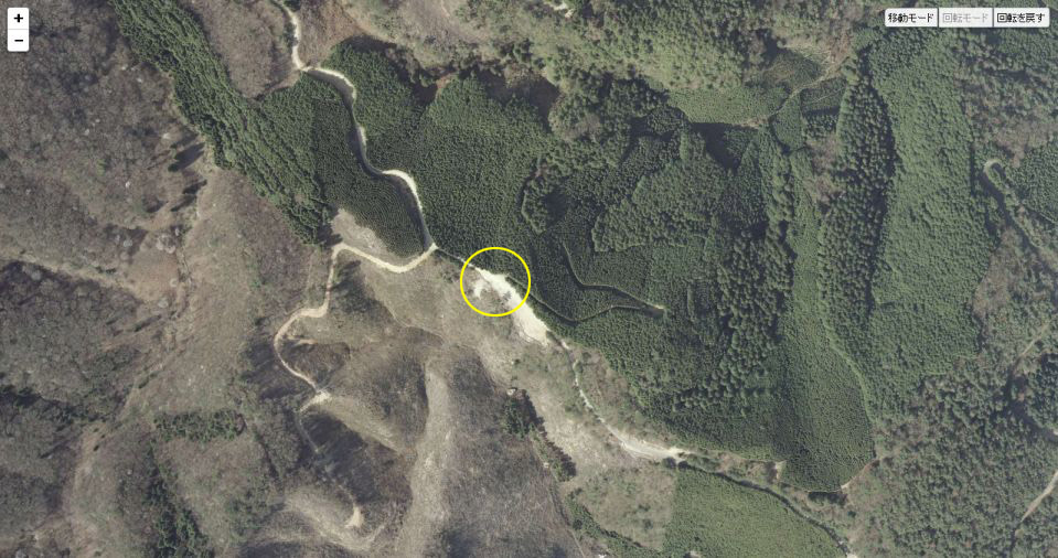 国土地理院の「国土変遷アーカイブ」による現地周辺の2008年撮影の航空写真。黄色い円内がロケ地。