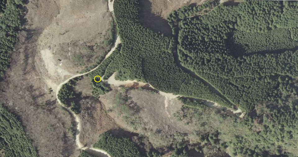 | 2008年撮影の航空写真。黄色い円が茶店の場所。切り通し部分の赤茶けた斜面がよくわかるので紹介してみる。 ↓ |