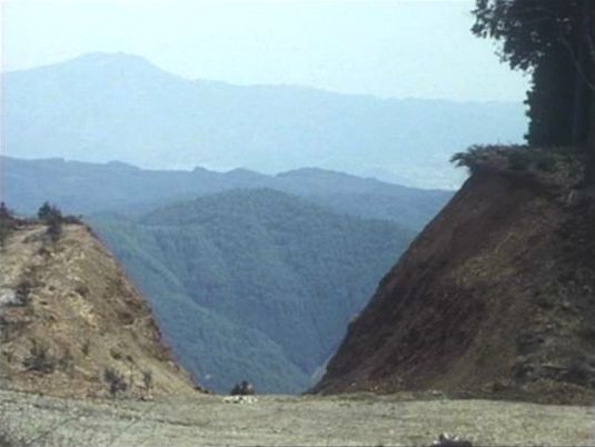 | 切り通し方向からカメラが右へパンしていくシーン。やや高い位置にある谷山林道の本道が見えてくる。 ↓ |