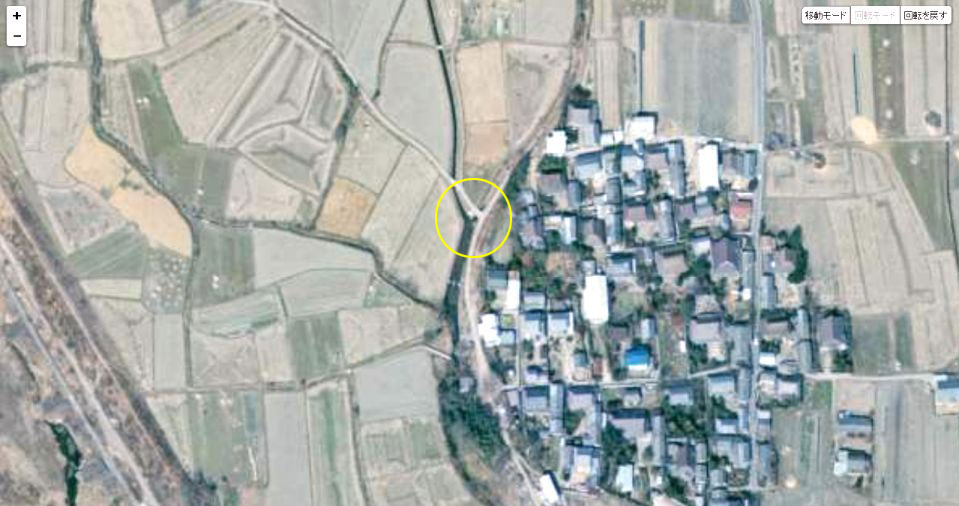 | 国土地理院の「国土変遷アーカイブ」による現地周辺の1974年撮影の航空写真。黄色い円内が用水路のロケ推定地。Y字型に交差する用水路と橋が見える。なお現地は耕地整理が進み、この用水路は無くなった。 ↓ |