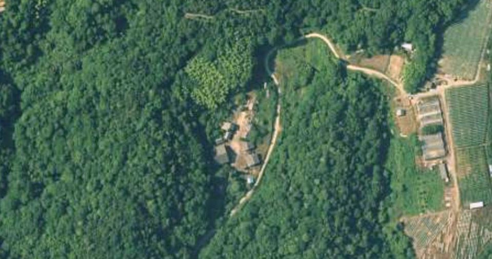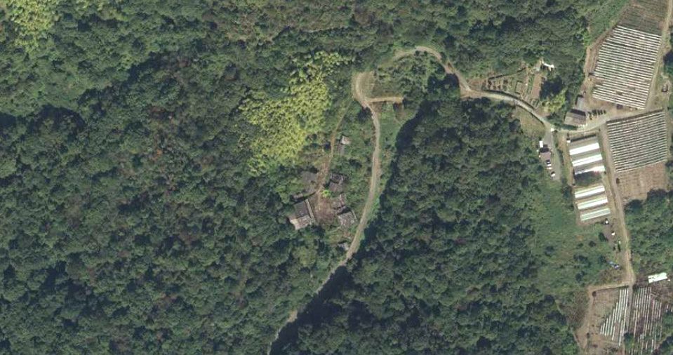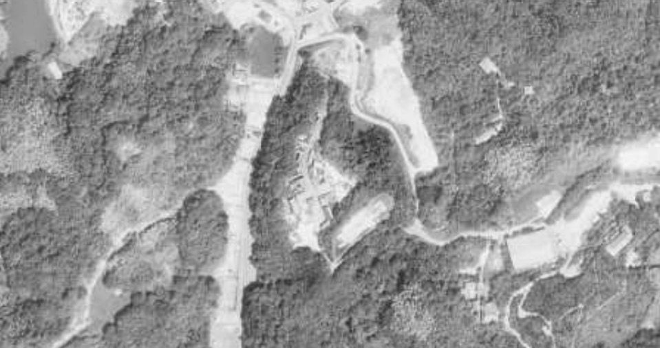 | 「みろくの里」の北部にあるセット。坂道の宿場という設定らしい。国土地理院の「国土変遷アーカイブ」による現地周辺の1994年撮影の航空写真。 ↓ |