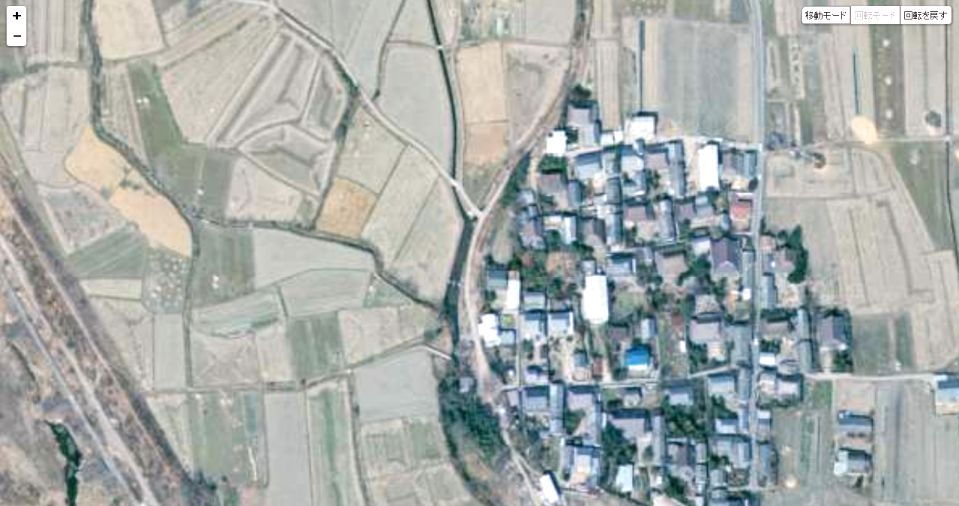 | 国土地理院の「国土変遷アーカイブ」による現地周辺の1974年撮影の航空写真。中央のY字型に交差する用水路がロケ推定地。なお現地は耕地整理が進み、この用水路は無くなった。 ↓ |