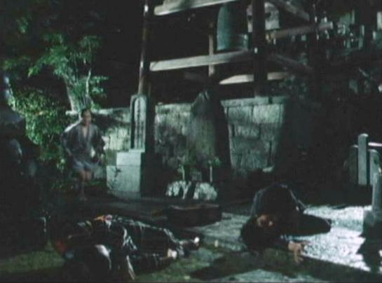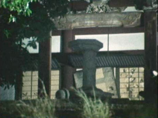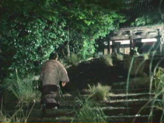 阿弥陀堂前の石段からの見上げだと思う。小道具満載で荒れ寺演出。なお現在の阿弥陀堂は極彩色に彩られている。