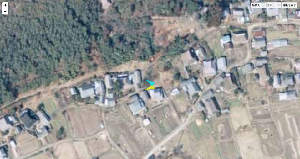 | 国土地理院の「国土変遷アーカイブ」による現地周辺の1974年撮影の航空写真。黄色い矢印が画像A、水色の矢印が画像B・画像Cの撮影方向。 ↓ |
