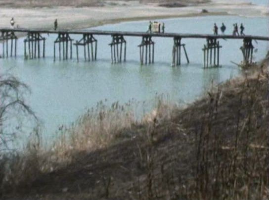 橋脚がすべて木造だったころの画像。昭和47年に木津川が常時流れている部分の橋脚17基がコンクリート製に変わった。