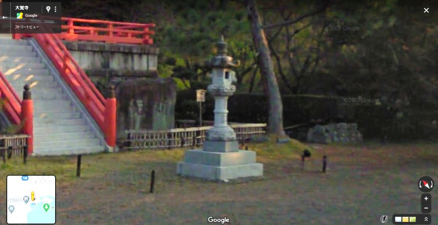 グーグルのストリートビューの同寺心経宝塔の画像。本編には基壇の角と石燈篭が映っていると思う。