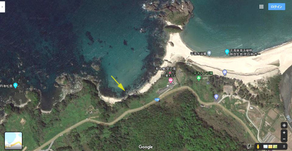 | グーグルの空中写真。黄色い矢印は、本編画像左端に見える浜辺の巨岩。 ↓ |