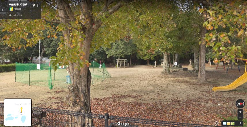 | グーグルのストリートビューの画像。本編では中央の鳥居を石碑で隠している。 ↓ |