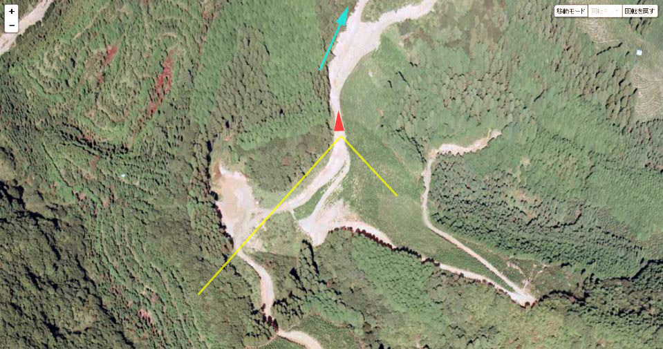 | 国土地理院の「国土変遷アーカイブ」による現地周辺の1987年撮影の航空写真。画像Aは黄色い画角で撮っていると思う。赤い矢印は画像Bの撮影方向。水色の矢印はダルマ峠への上り道。 ↓ |
