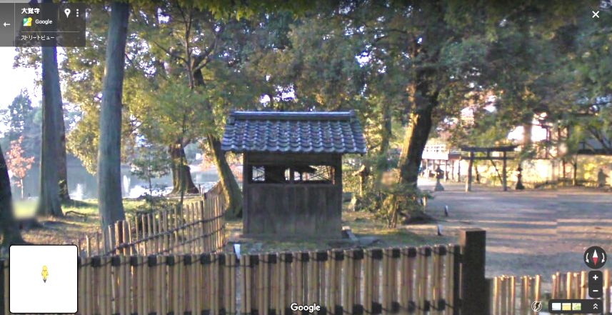 | グーグルのストリートビューによる、大覚寺の五社明神東の気比・多賀大明神社の画像。この手前に門のセットを組んだのではなかろうか。 ↓ |