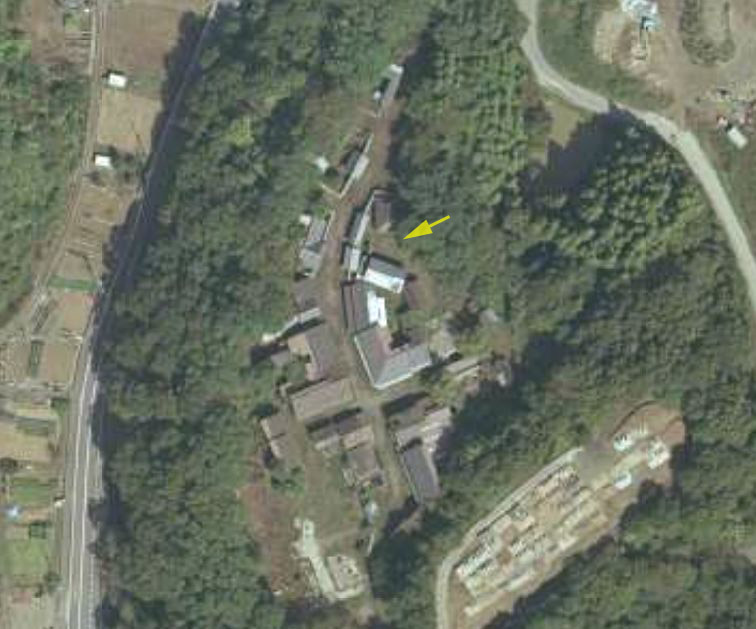 「みろくの里」の南部にあるセット。国土地理院の「国土変遷アーカイブ」による現地周辺の2010年撮影の航空写真。黄色い矢印が屯所として使用された。