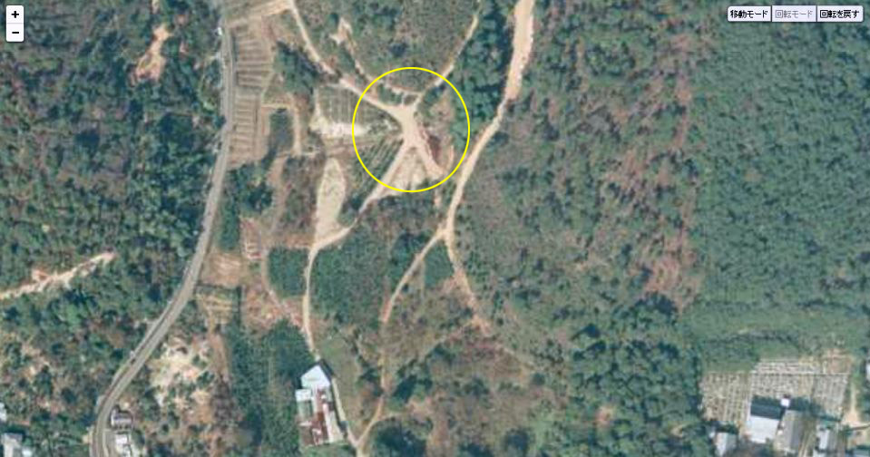 | 国土地理院の「国土変遷アーカイブ」による1982年撮影の航空写真。黄色い円内がロケ推定地。 ↓ |