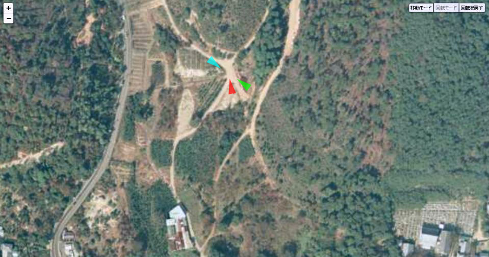 | 水色の矢印は画像A、緑の矢印は画像B、赤い矢印は画像Cの撮影方向。道の交差具合や枝道の位置関係などが一致していると思う。ちなみにここは後年石垣が組まれた場所。 ↓ |