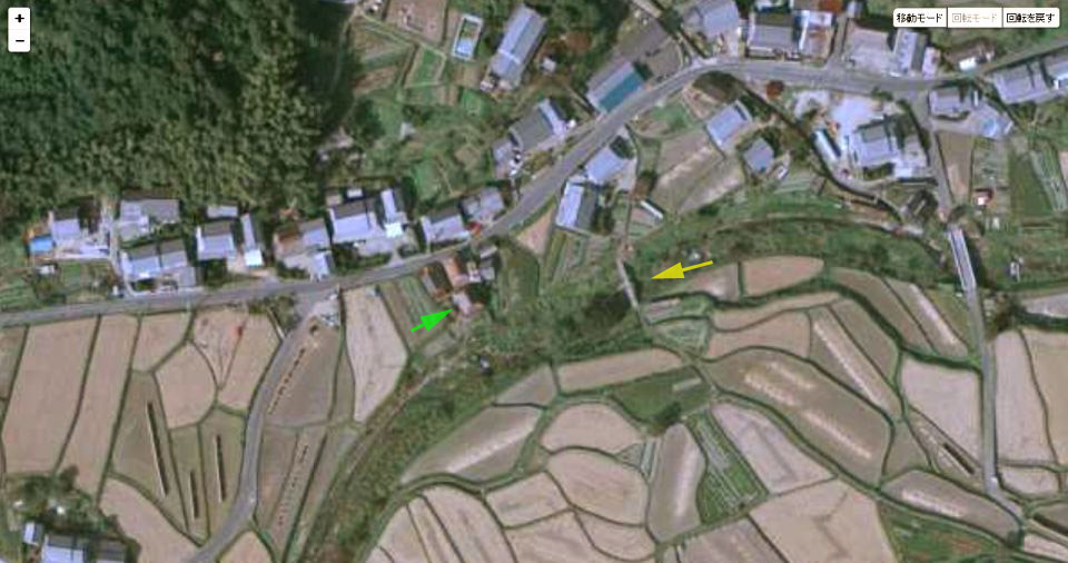 | 国土地理院の「国土変遷アーカイブ」による1982年撮影の航空写真。黄色い矢印が橋。橋の横には大きな木があり、緑の矢印には萱葺民家も見える。 ↓ |