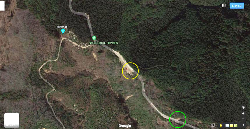 いつもの枝道。上の緑の円内がロケ地。
