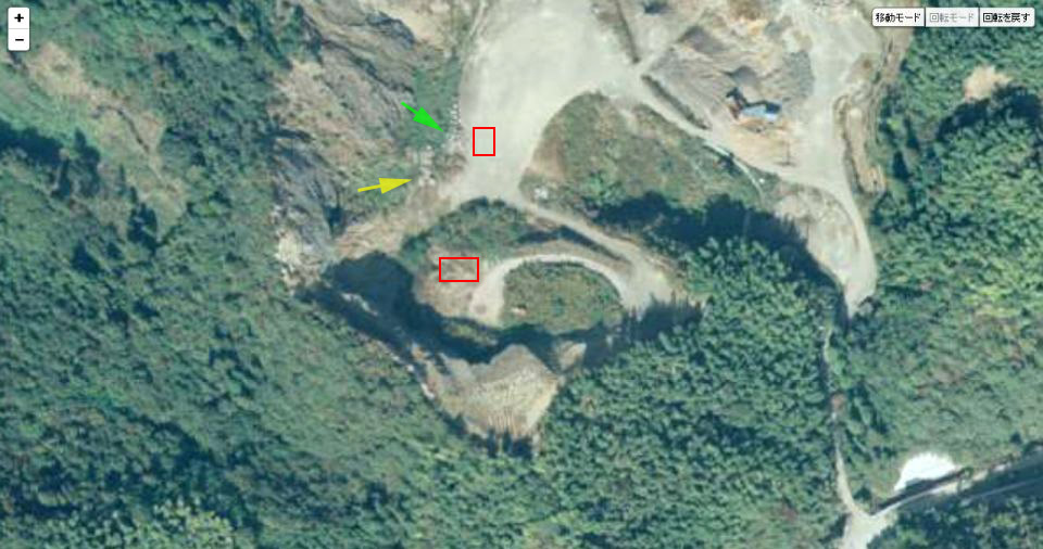 上の拡大。赤い四角は小屋の位置。矢印は積み上げられた岩。特に黄色い矢印には、大き目の岩が2つ見える。