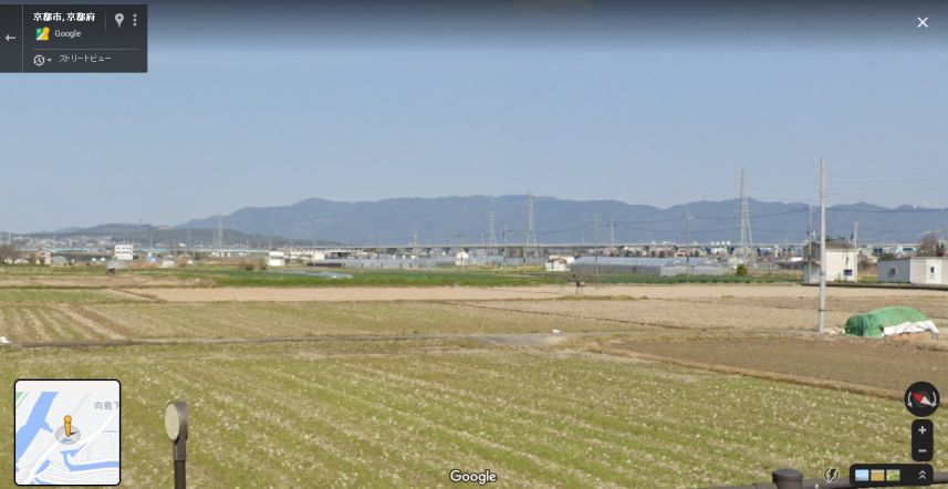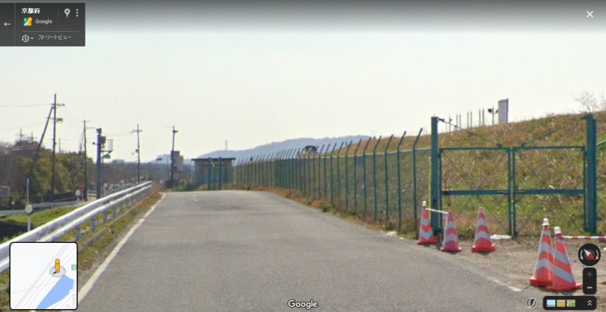 | グーグルのストリートビューの画像。左手に宇治川の堤防がある。 ↓ |