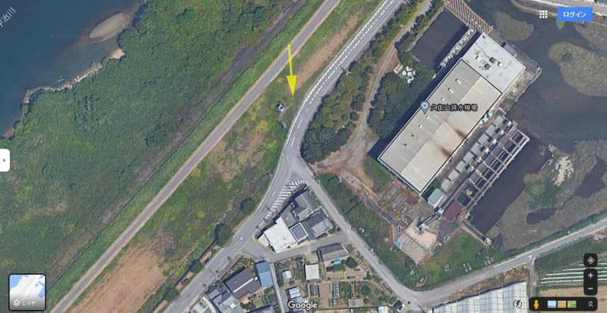 | 「京都府久世郡久御山町森中内」のグーグルの空中写真。堤防の上から矢印方向を撮っていると思う。本編左手に映っているのは、建設中の排水機場らしい。 ↓ |