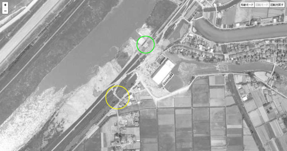| 国土地理院の「国土変遷アーカイブ」による1973年撮影の同地の航空写真。黄色い円内が画像Aの橋らしい。この橋は現在存在しないが、排水機場建設に伴う迂回路用仮設橋かもしれない。 ↓ |