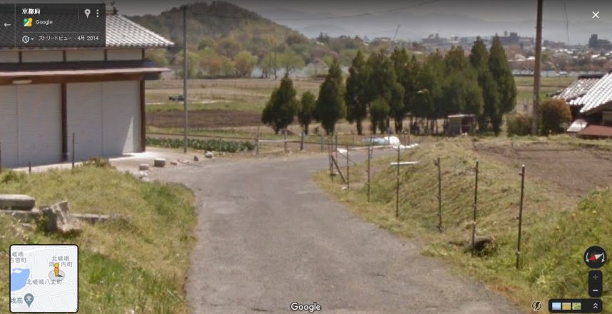 | 「京都市右京区北嵯峨八丈町」と「北嵯峨洞ノ内町」の境の道だと思う。 ↓ |