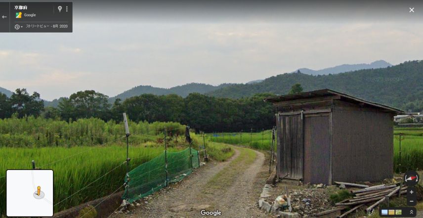 「京都市右京区北嵯峨六代芝町」の「民宿わらびの里」の西沿いの道だと思う。