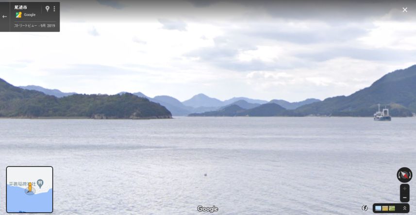 | 広島県尾道市浦崎町から取得したグーグルのストリートビューの画像。ロケ地はこの近隣の海岸かと思われるが、左手の「加島(無人島)」が怪しい。 ↓ |